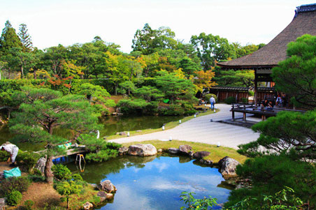 池泉式指園林構架以池塘和流泉組合為主景觀,筑山庭則是偏重于地形上筑土為山,平庭對應于筑山庭指在平坦的基地上進行園林規劃,在平地上追求深山幽谷之玲瓏,海岸島嶼之渺漫的效果;筑山庭庭都有真、行、草、三種形式,真庭是對真山真水的全方位模仿,而行庭是局部的模擬和少量的省略;草庭是大量的省略。