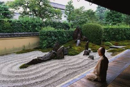 枯山水是日本庭園的精華,實質是以砂代水,以石代島的做法。用極少的構成要素達到極大的意韻效果,追求禪意的枯寂美??萆剿袃煞N寓意對象,一是山澗的激流或瀑布,日本稱之為枯瀧;另一種是海岸和島嶼;池泉是微縮的真山水,池泉一般是園景的中心,枯山水與池泉都是在自然布局的水池中設溪坑石代表島嶼,與岸相連的駁岸稱中島按不同位置分別稱為龜島、鶴島、等名,立在水中或砂中的巖石有更多名稱,在此不再贅述。